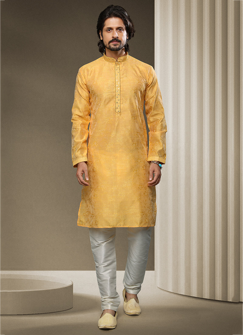 Yellow Brocade Silk Traditional Wear Jacquard Kurta Pajama