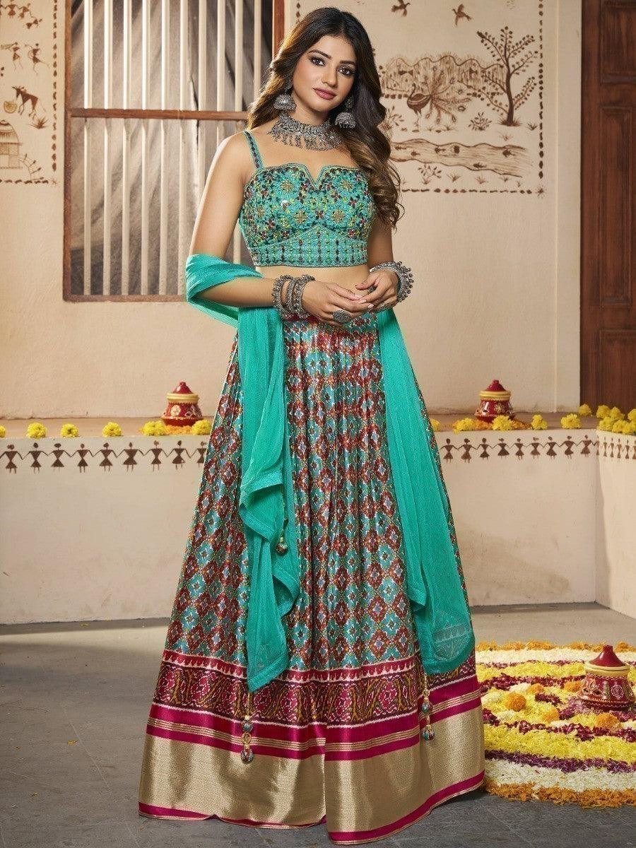 Product Speciality: Enhance your elegance and grace with our stunning "attractive turquoise patola print silk lehenga with embroidered choli." This exquisite ensemble is crafted with utmost care and attention to detail, making it a perfect choice for weddings, receptions, and other special occasions. Let us take you through the incredible benefits and key features of this mesmerizing outfit. The turquoise silk material lehenga is adorned with a beautiful patola print and lagdi patti work, adding a touch of traditional charm to your attire.