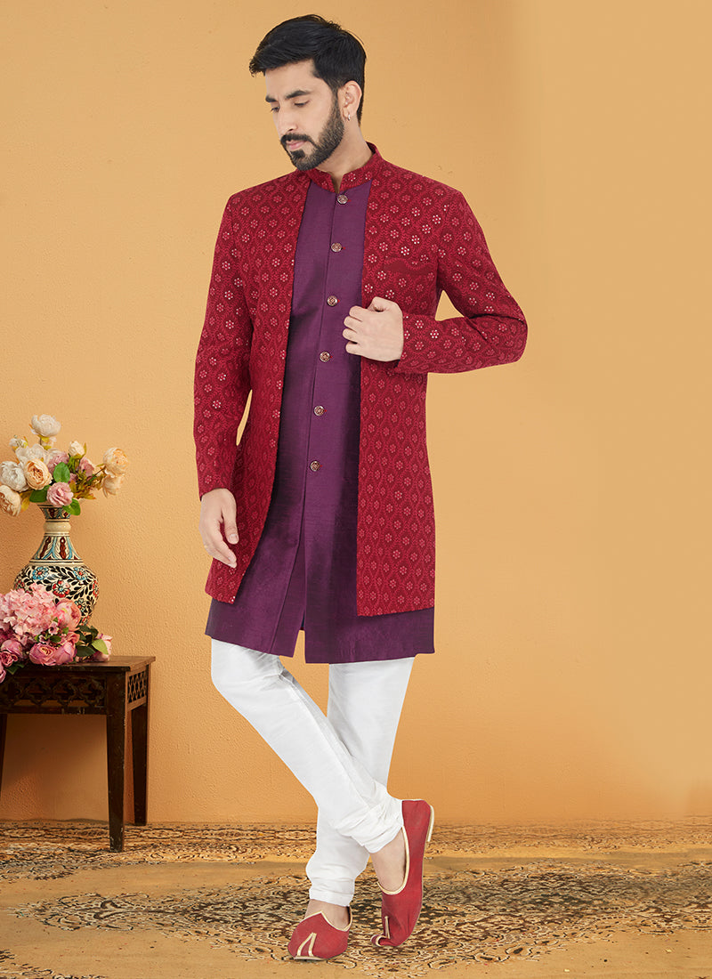 Red Magenta Georgette Banarasi Dhupion Wedding Wear Embroidery Work Mens Indo Western