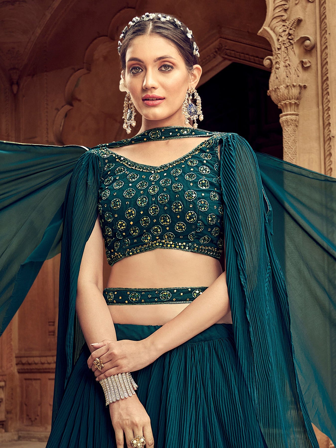 Product Speciality: Step into elegance with this stunning teal blue georgette crushed lehenga, crafted to make you feel like a princess on your special day. The lehenga is semi-stitched up to 42 inches, ensuring a perfect fit that flatters your silhouette. Paired with a matching georgette choli featuring exquisite embroidered work, this ensemble radiates sophistication. Completing the look is a beautiful net dupatta adorned with delicate lace work, adding an ethereal touch. With its captivating color and intricate detailing, this teal blue lehenga choli is the perfect choice for enhancing your wedding look as you celebrate love and happiness. Disclaimer: Slight color variation may occur due to photographic reasons.