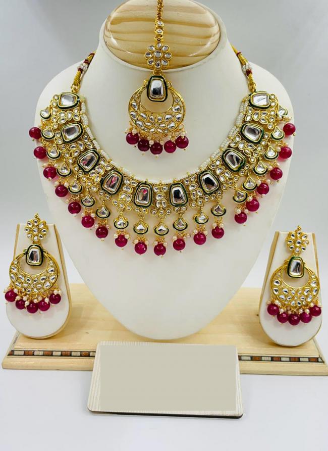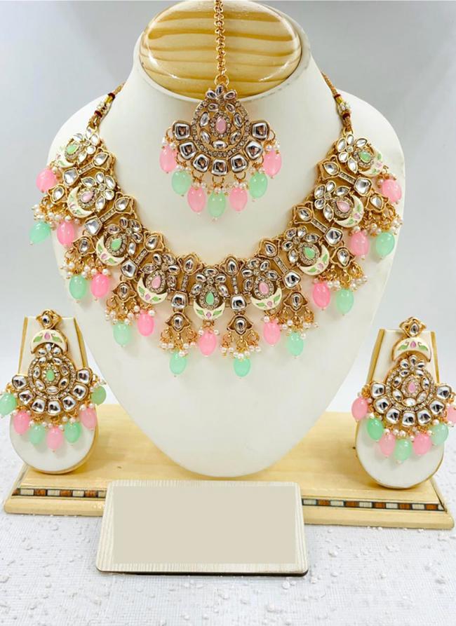 Bridal Wear Pink Green Color Kundan Necklace Set