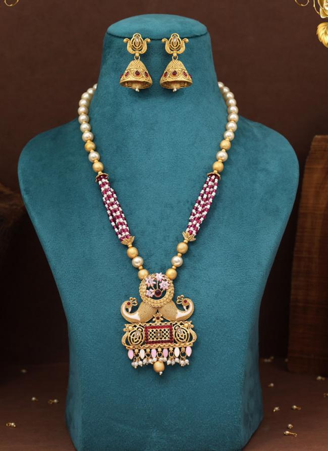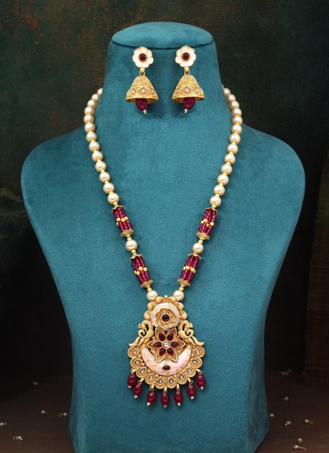 Traditional Wear Rani Color Matte Gold Rajwadi Temple Necklace Set