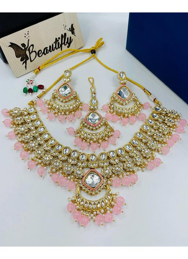 Wedding Wear Pink Heavy Polki Kundan With Pearl Drops Necklace Set