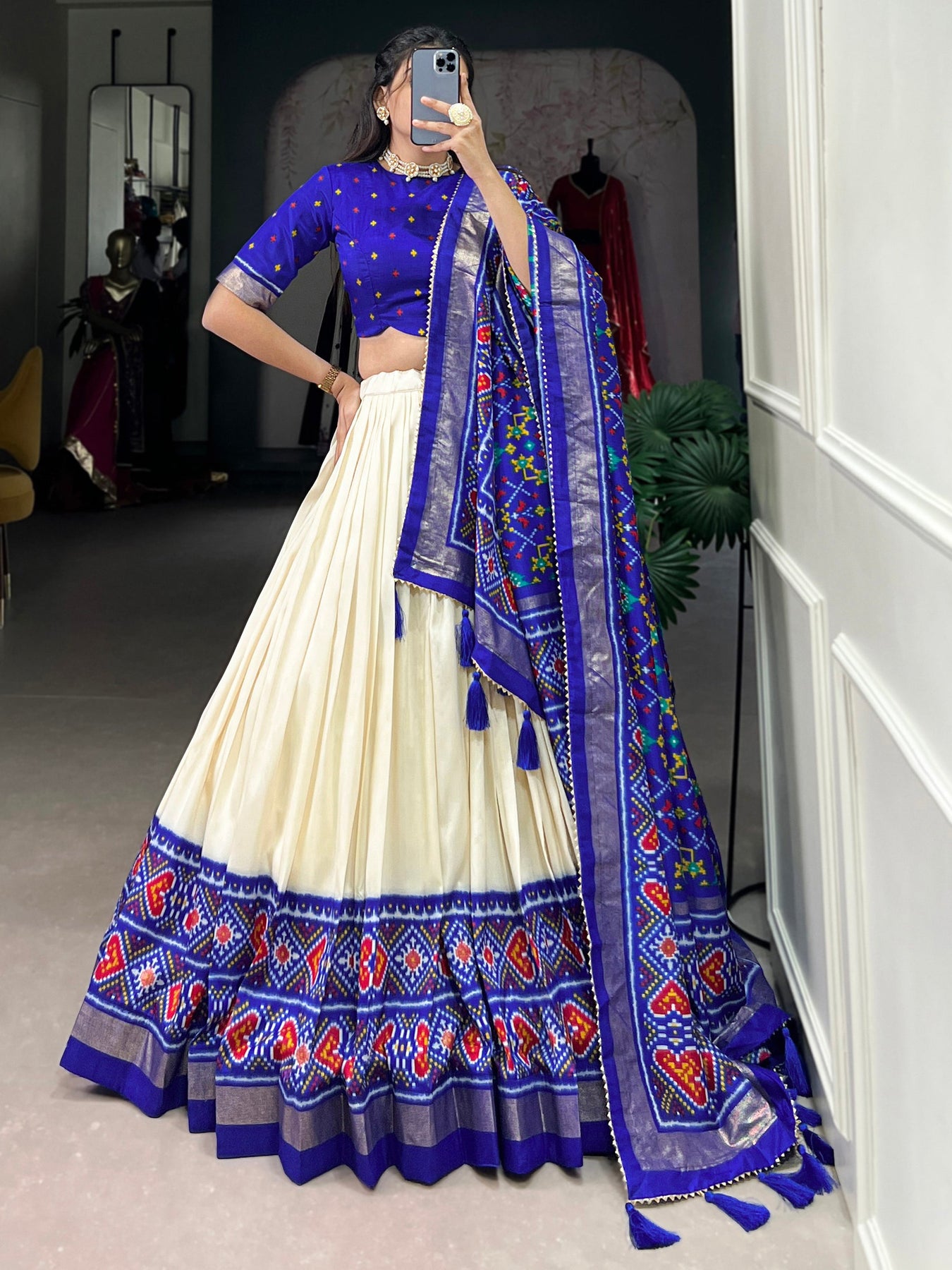 Product Speciality: Embrace elegance and grace with this stunning blue tussar silk lehenga, a perfect blend of traditional artistry and contemporary style. The lehenga is beautifully crafted with intricate patola print work and adorned with a weaving border, creating a captivating visual effect that stands out at any festive occasion. Designed as a semi-stitched piece up to 42 inches, it allows you the freedom to tailor it to your desired fit, ensuring both comfort and sophistication. The ensemble is complemented by a matching tussar silk choli, featuring the same exquisite patola print and weaving details, which harmoniously ties the look together. Accompanying the lehenga is a matching dupatta, showcasing vibrant patola prints framed with a delicate gotta patti lace border, complete with charming tassels on both sides. Disclaimer: Slight color variation may occur due to photographic reasons.