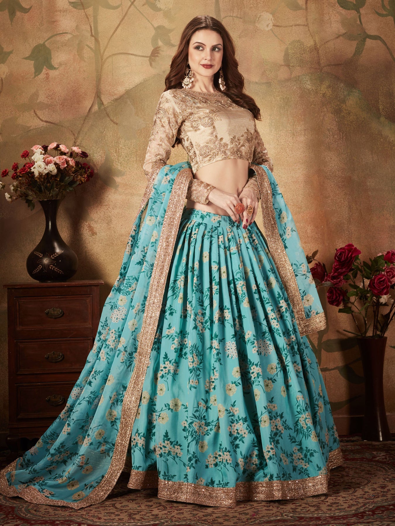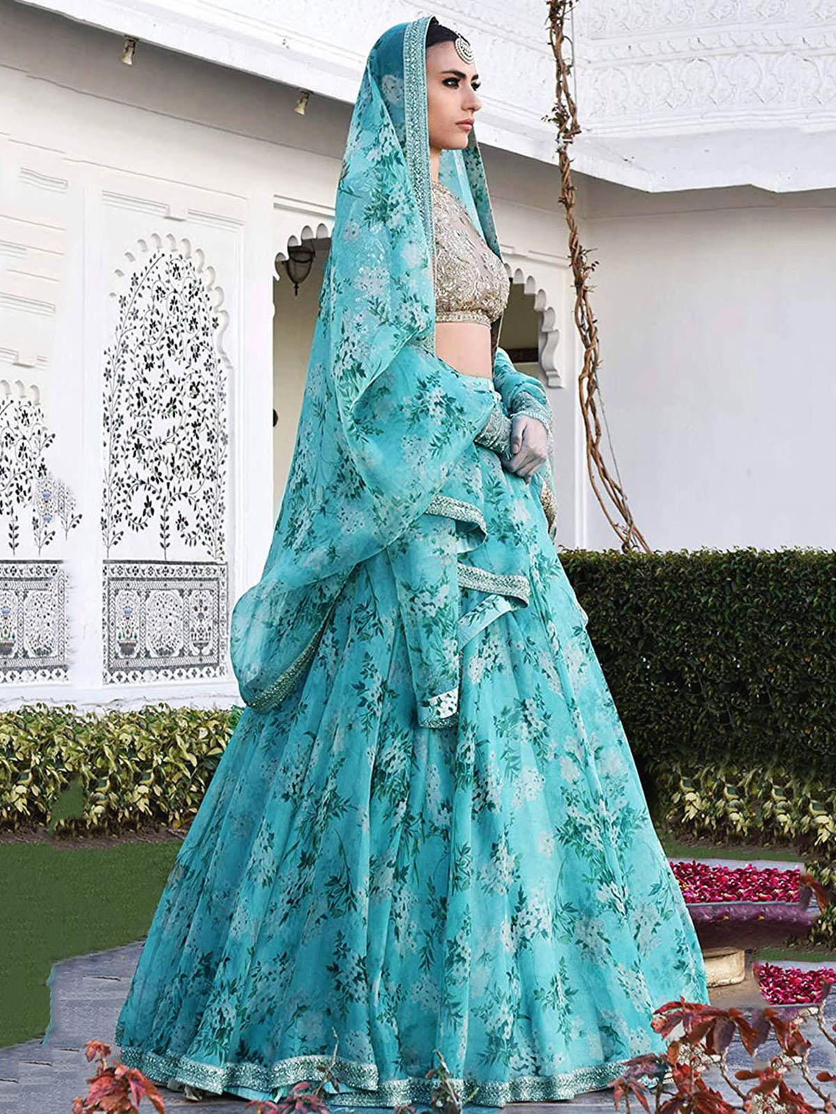 Sky Blue Floral Printed Organza Wedding Lehenga Choli