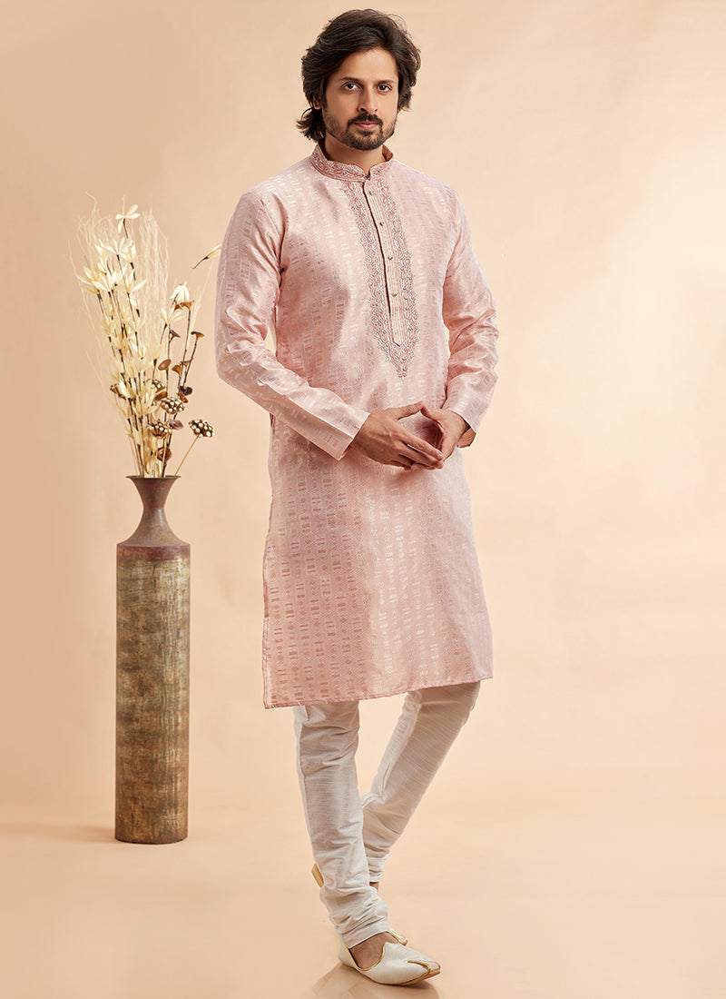 Jacquard Art Silk Peach Festival Wear Machine Work Readymade Kurta Pajama