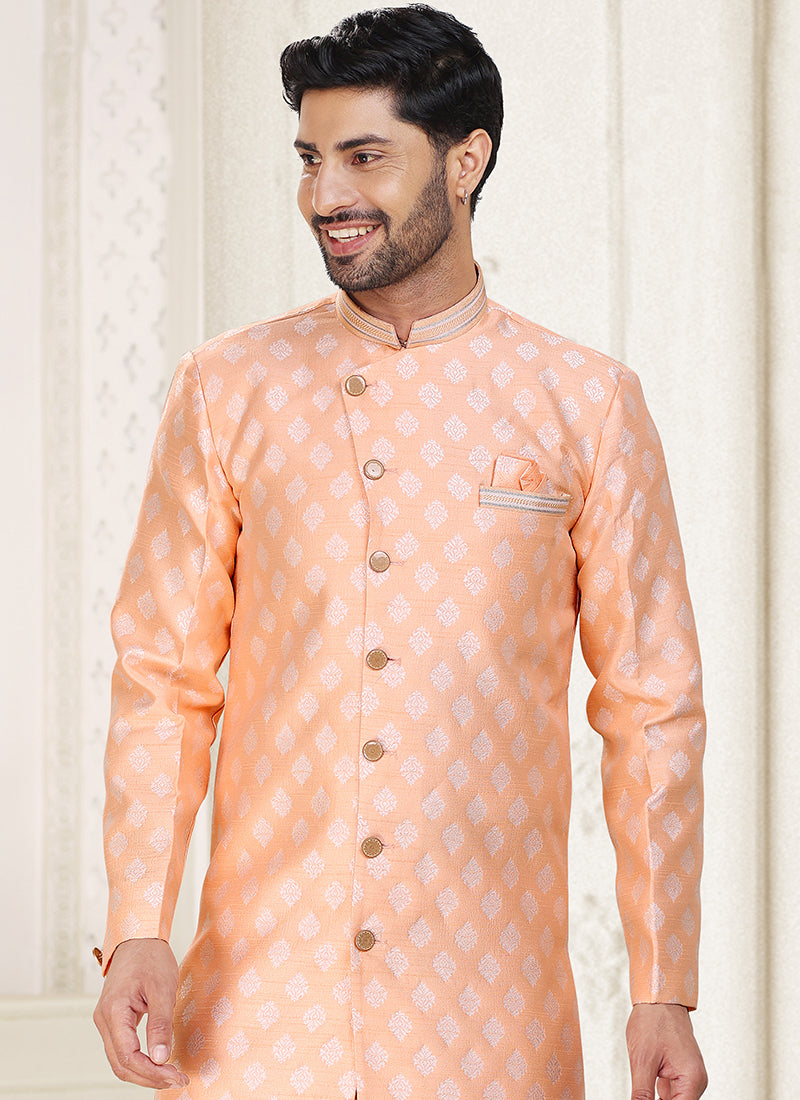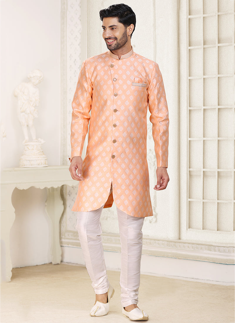 Product Speciality: Discover elegance and tradition with this beautifully crafted sherwani, perfect for weddings, festivals, and special occasions. Made from high-quality banarasi jacquard, this ensemble features intricate weaving that reflects timeless style.