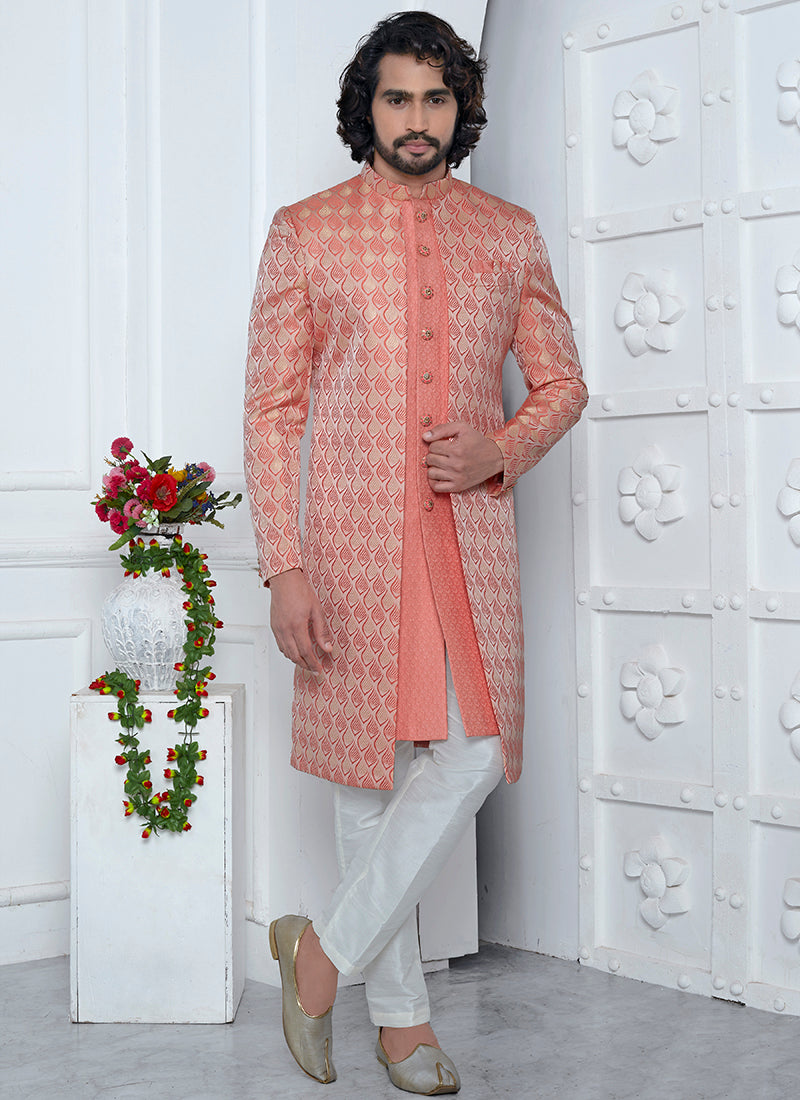Peach Pink Jaquard Silk Party Wear Pattern Pc Work Readymade Mens Indo Western