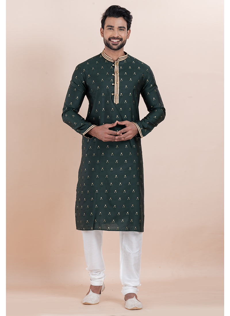 Silk Deep Green Ceremonial Wear Jacquard Work Readymade Kurta Pajama