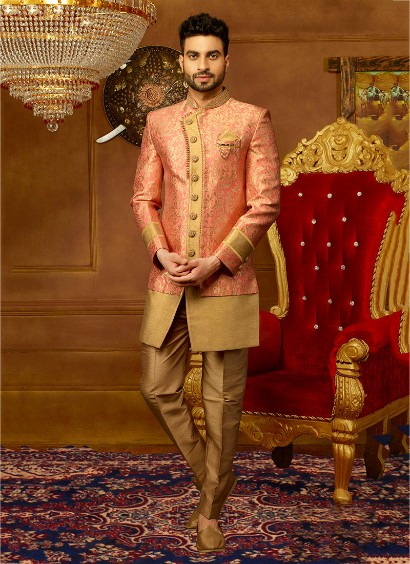 Peach Jacqaurd Wedding Wear Weaving Indowestern