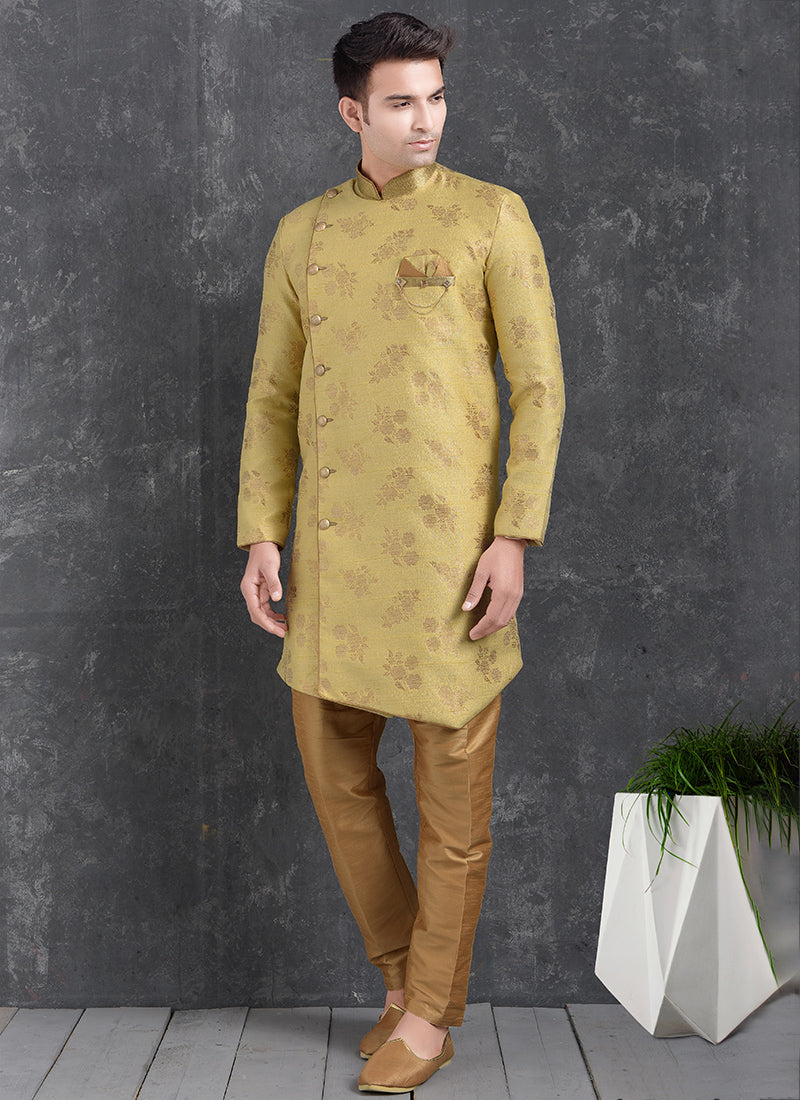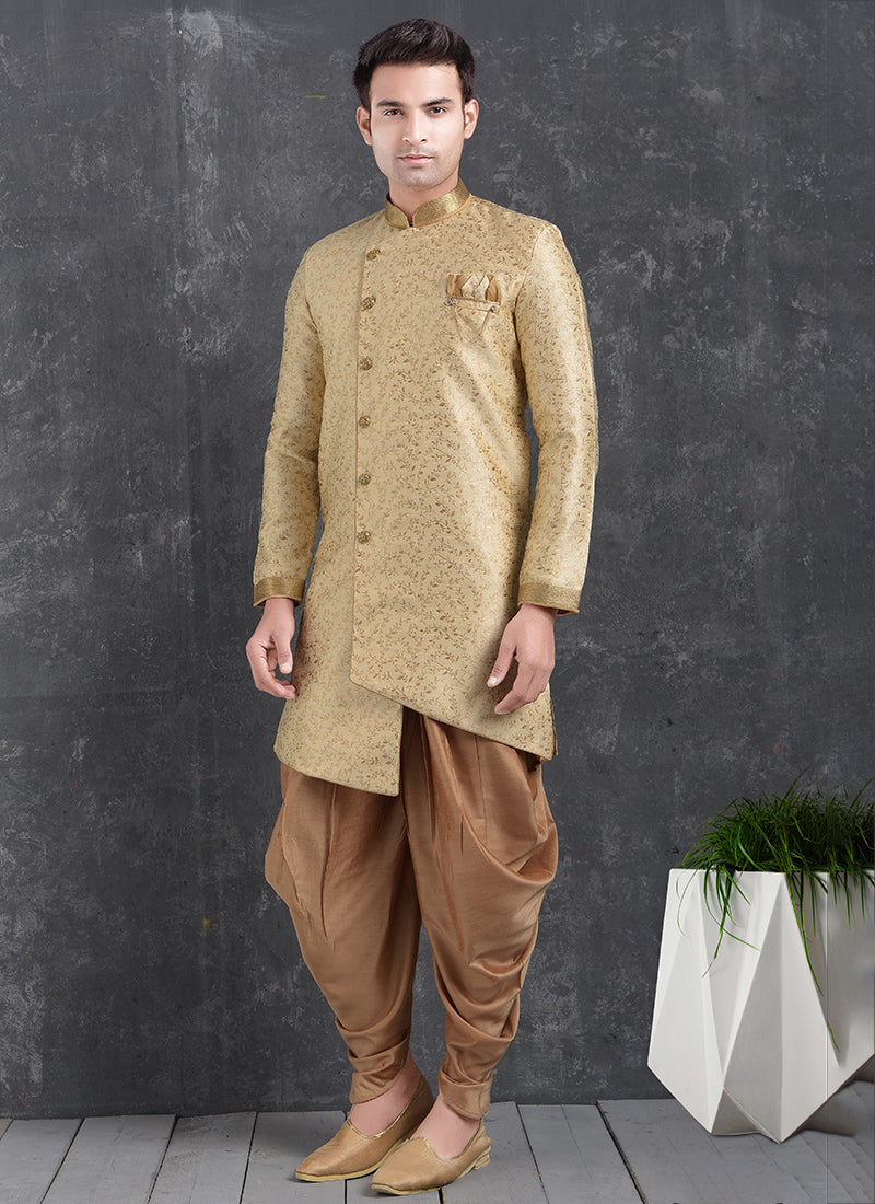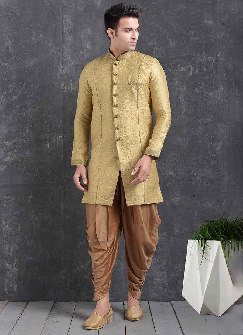 Gold Jaqurd Silk Brocade Festival Wear Pintux Peshawari Indo Western