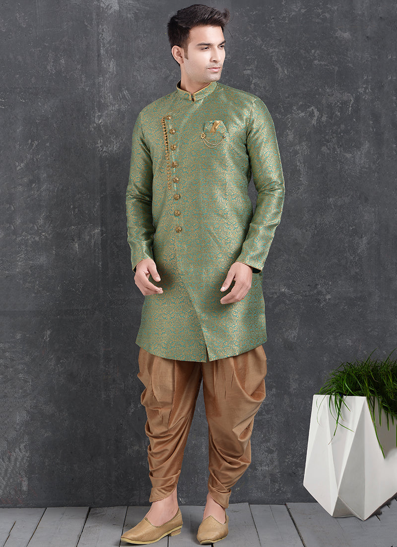 Green Jaqurd Silk Brocade Festival Wear Pintux Peshawari Indo Western