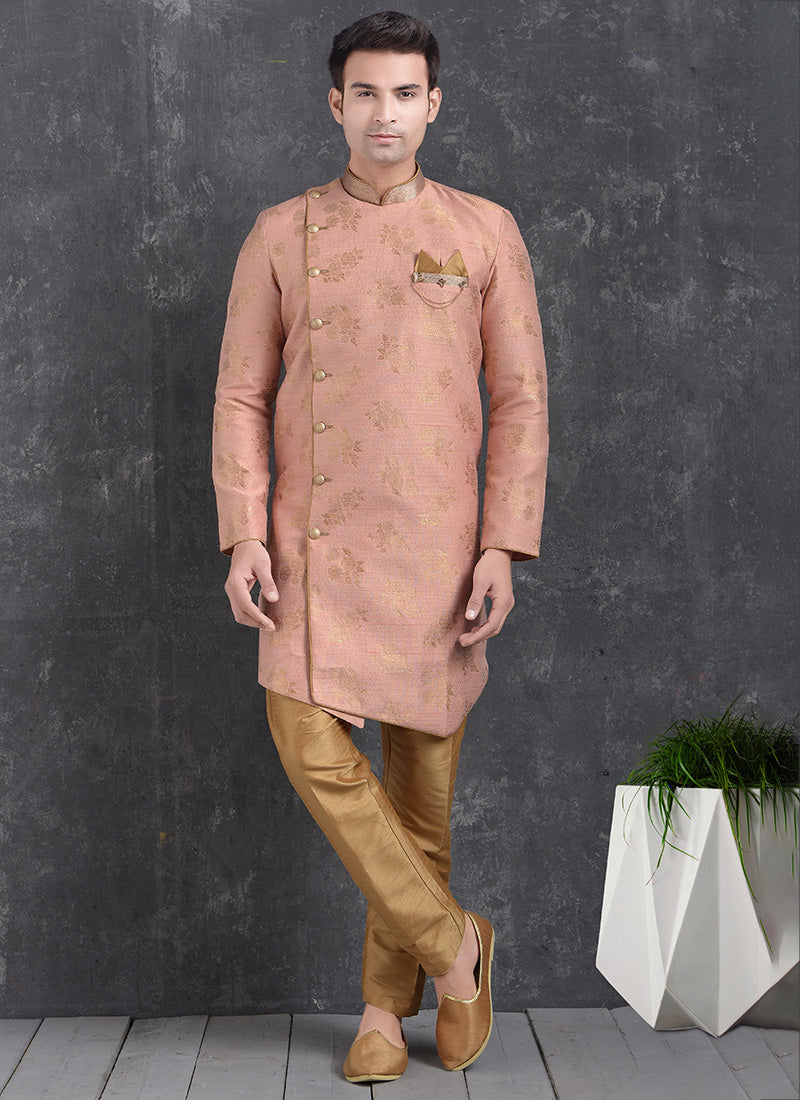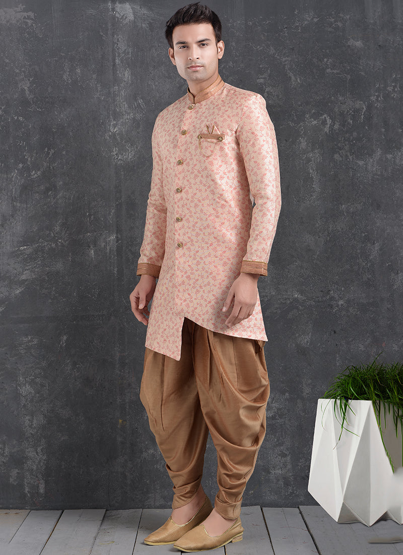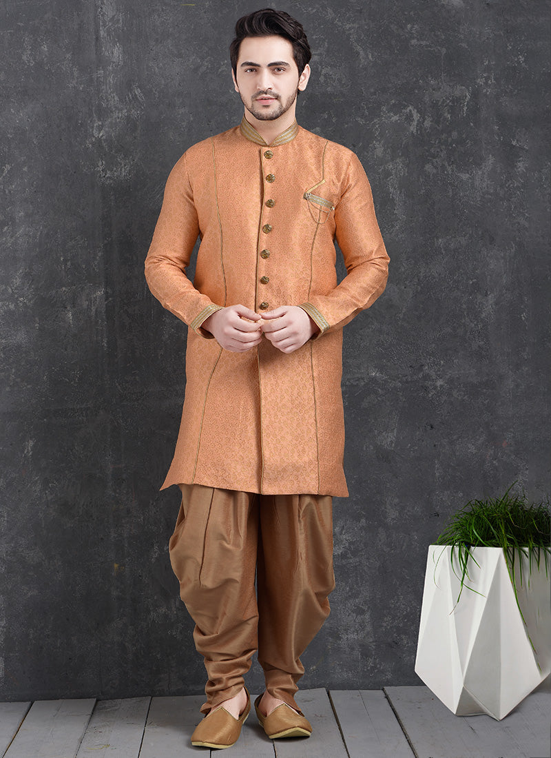 Peach Jaqurd Silk Brocade Festival Wear Pintux Peshawari Indo Western