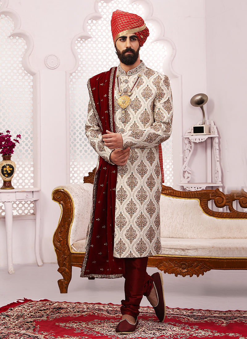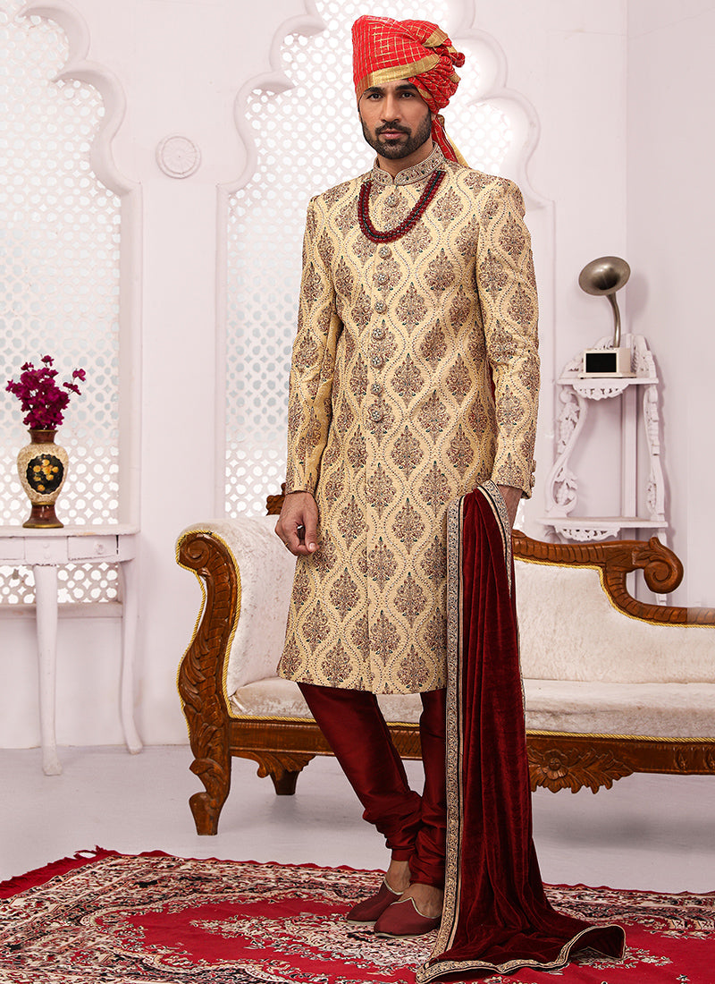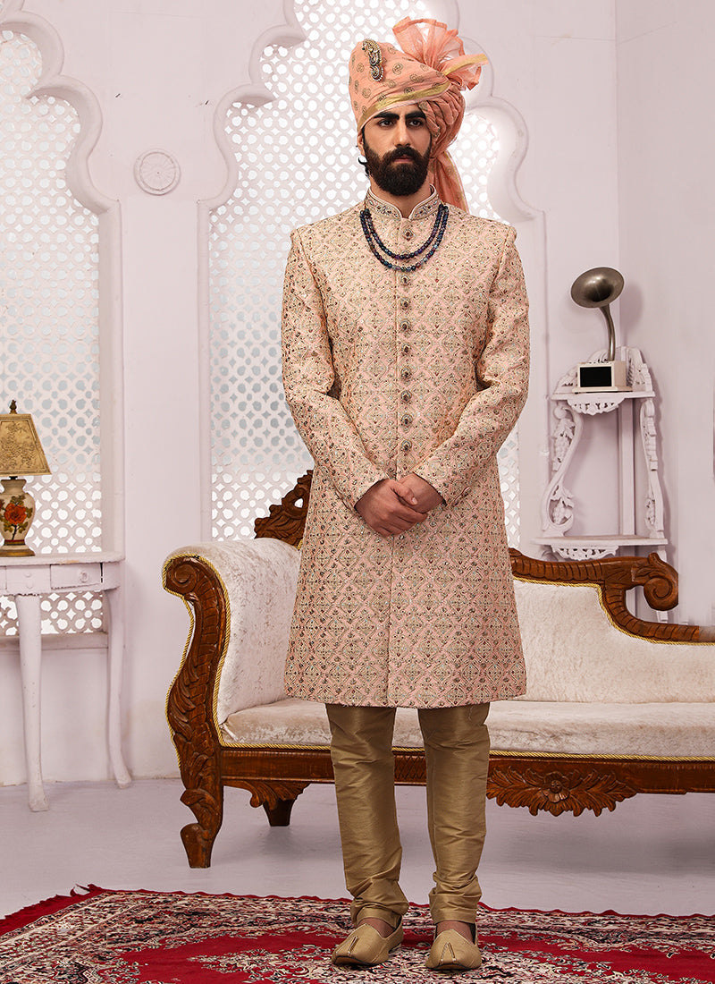 Onion cream Banarasi Silk Wedding Wear Embroidery Work Sherwani