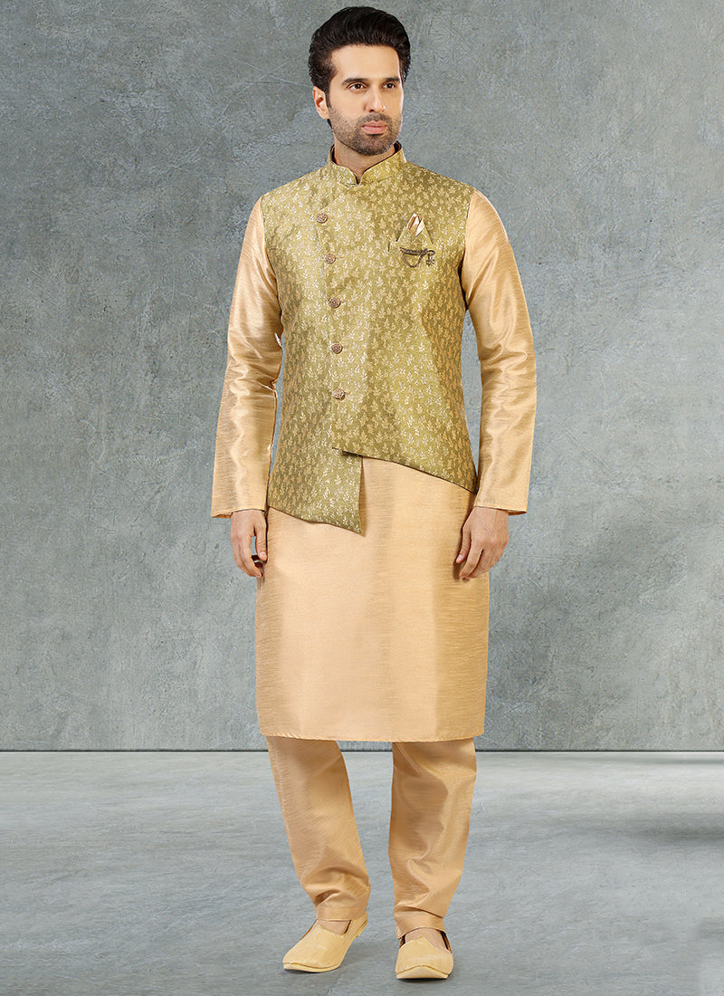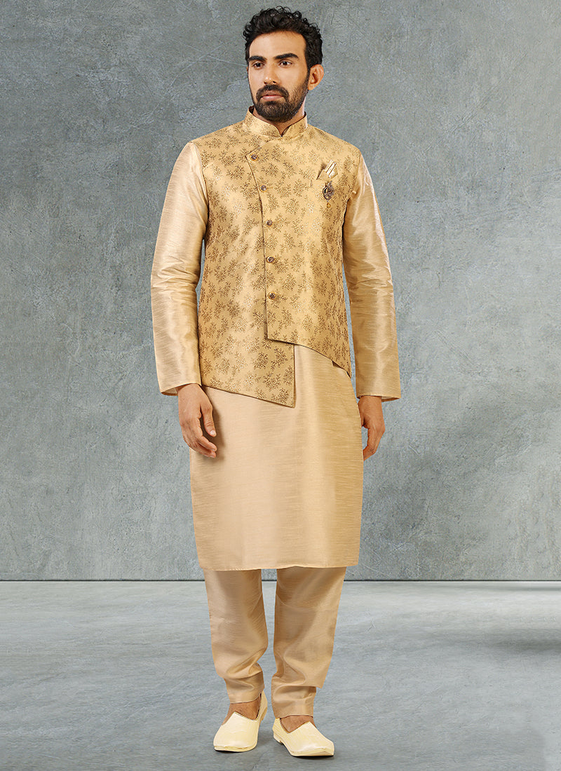 Gold Jaquard banarasi silk Party Wear Fancy Kurta Pajama With Jacket