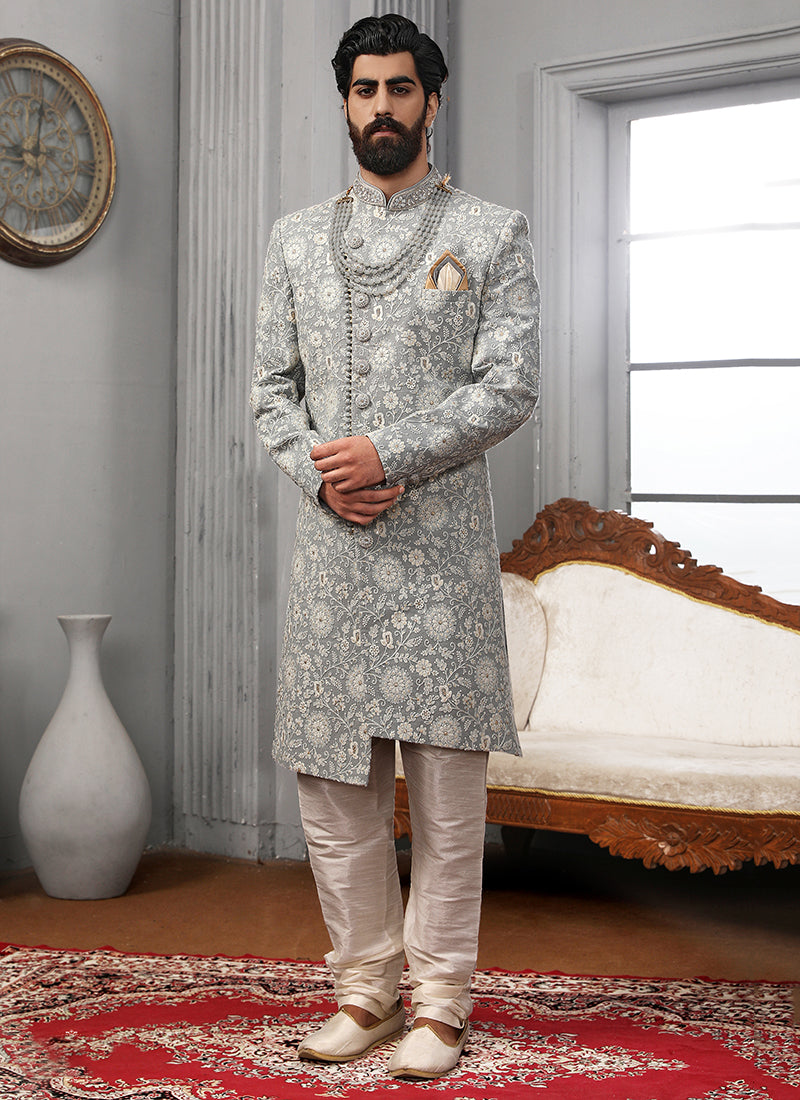 Grey Lucknowi Reception Wear Embroidery Work Sherwani