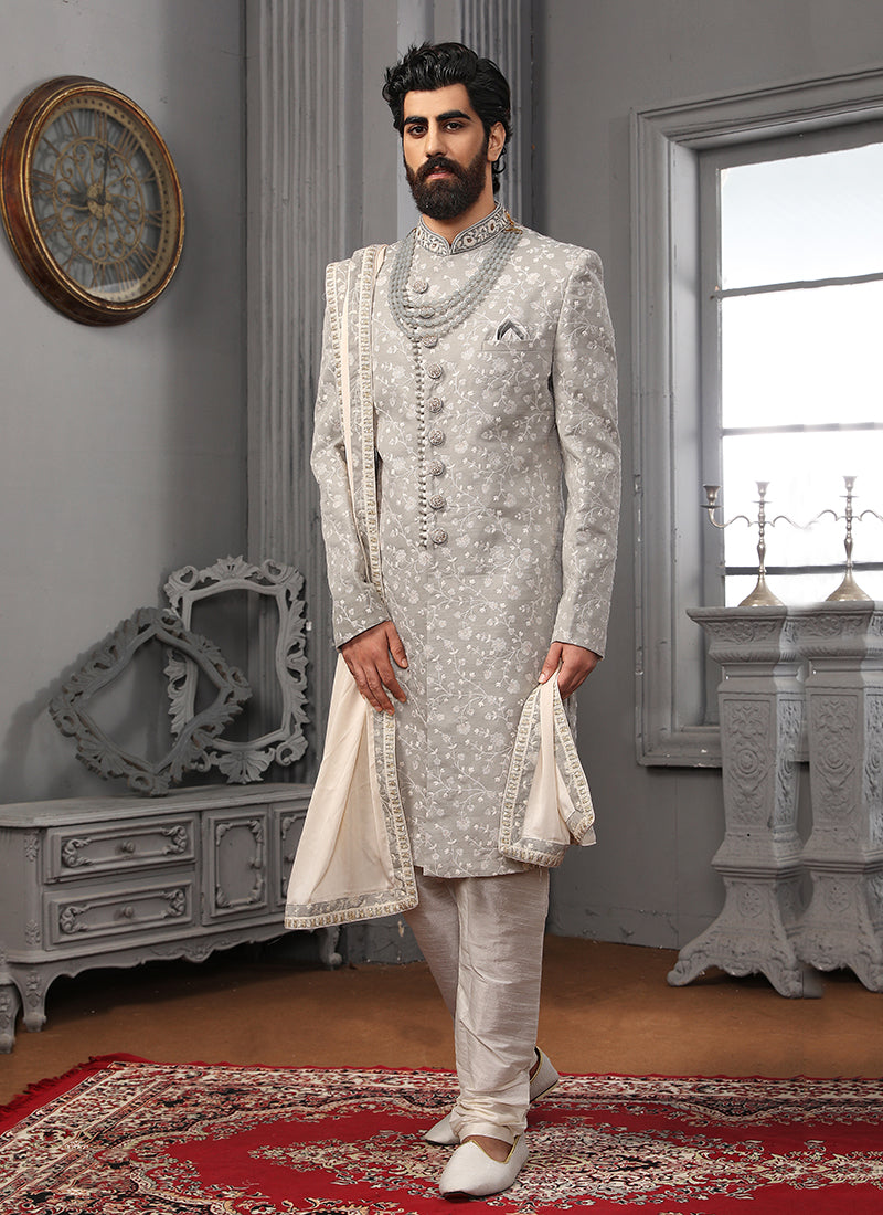 Light Grey Lucknowi Reception Wear Embroidery Work Sherwani Extra Charge For Dupatta