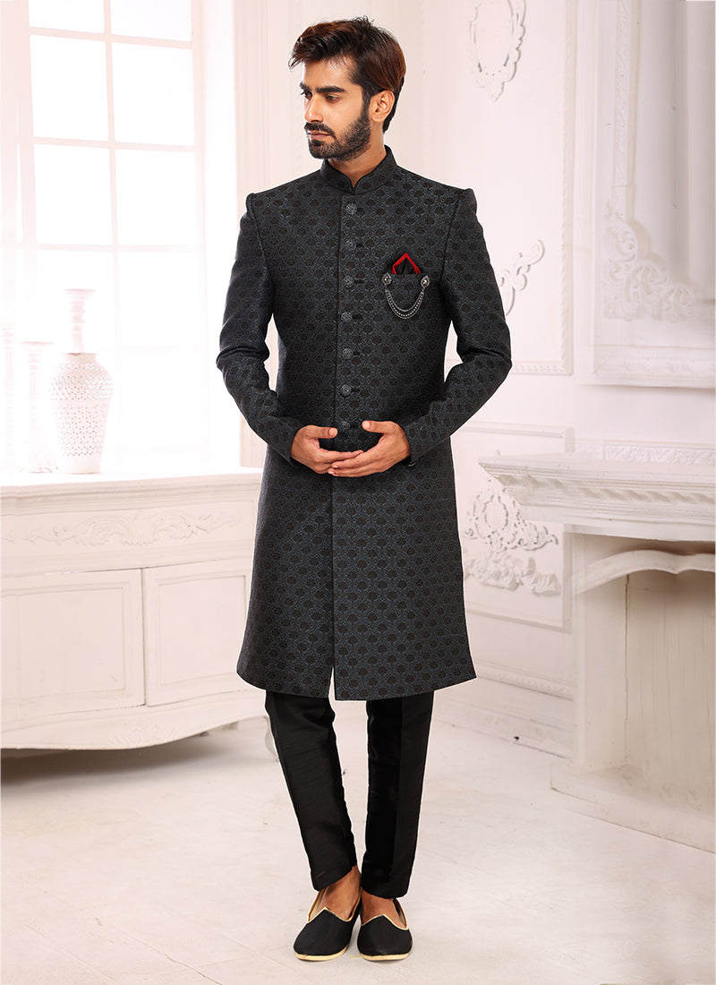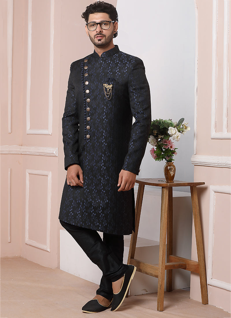 Black Imported brocade jaquard Wedding Wear Weaving Nawabi Indo Western
