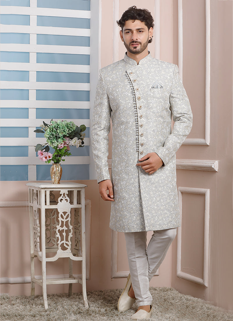 Light Grey Art Silk Wedding Wear Thread Work Indo Western Sherwani