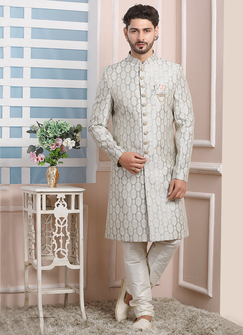 Light grey Imported brocade jaquard Wedding Wear Weaving Nawabi Indo Western