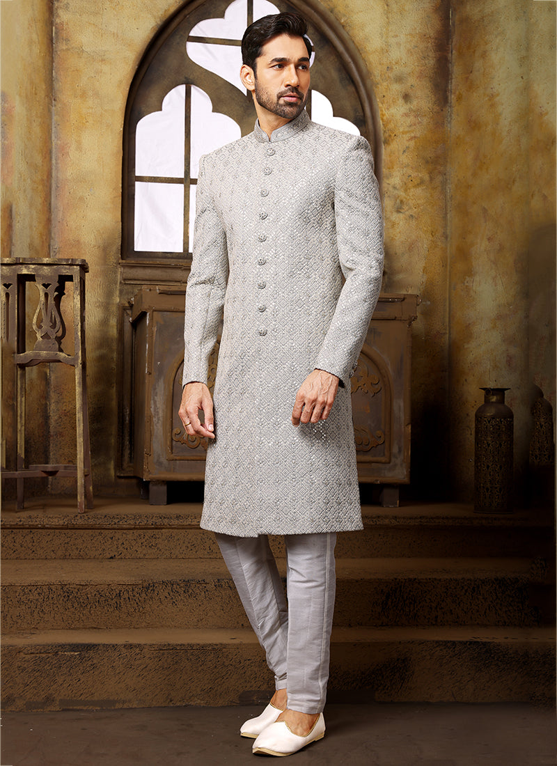 Grey Fancy Wedding Wear Weaving Nawabi Indo Western