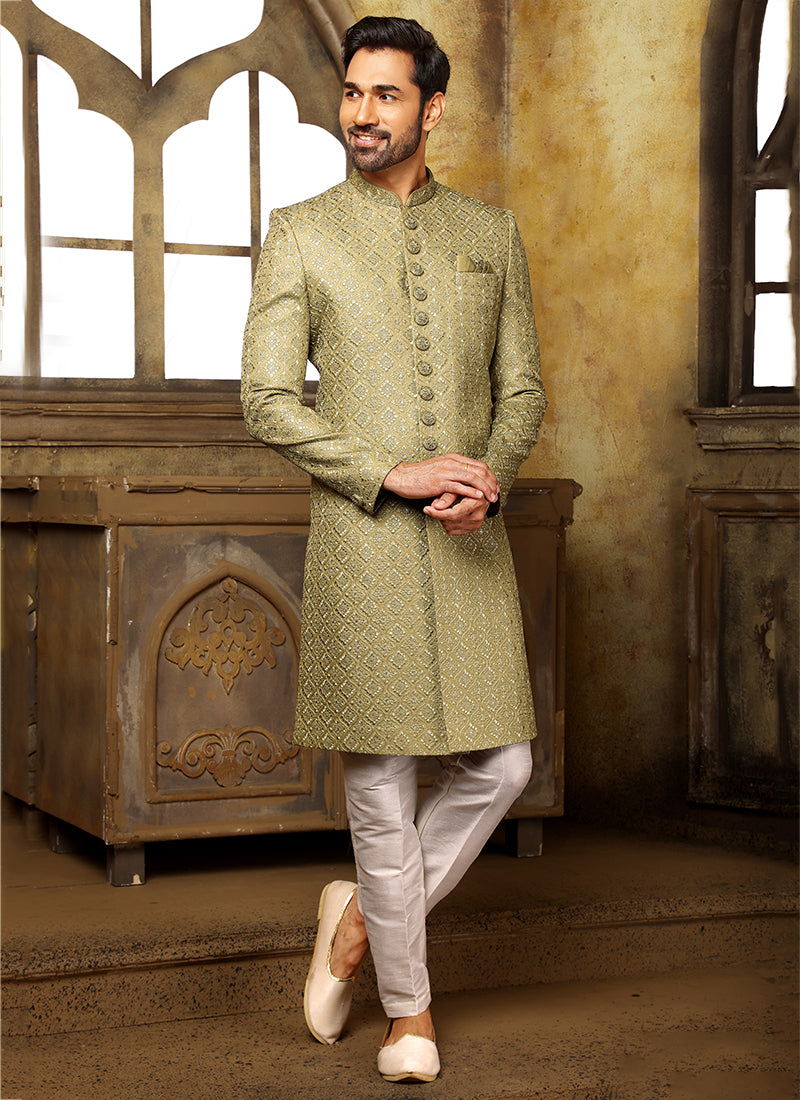 Light mehendi Fancy Wedding Wear Weaving Nawabi Indo Western