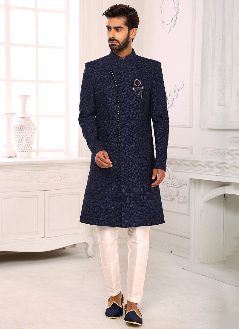 Navy blue Fancy Wedding Wear Weaving Nawabi Indo Western