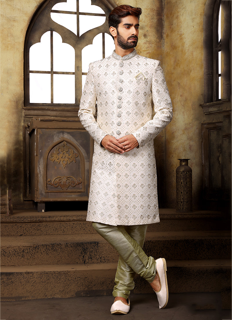 Off white pista Fancy Wedding Wear Weaving Nawabi Indo Western