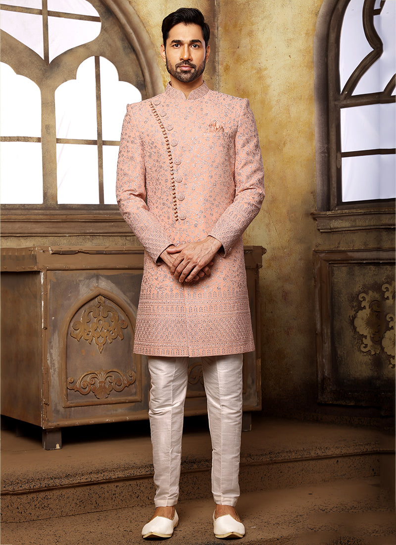 Peach Fancy Wedding Wear Weaving Nawabi Indo Western