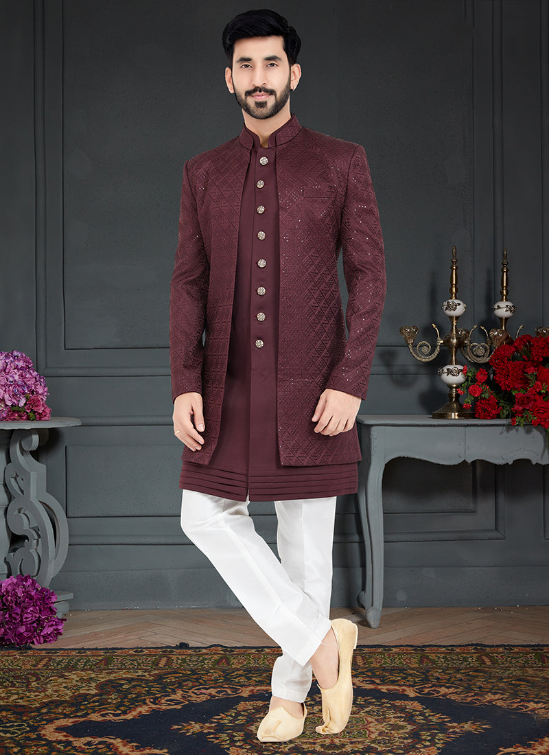 Dark Maroon Brown Soft Jecquard Traditional Wear Weaving Italian Indo Western