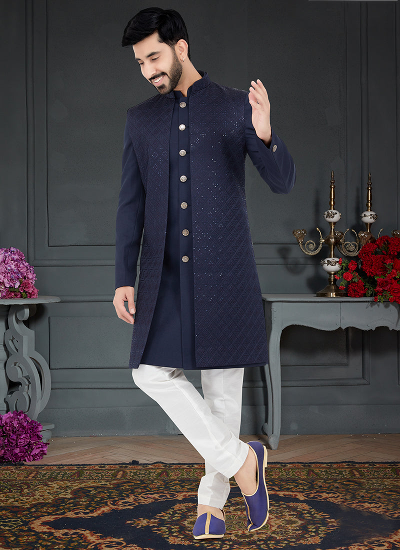 Aqua Sky Blue Jecquard Traditional Wear Weaving Nawabi Indo Western
