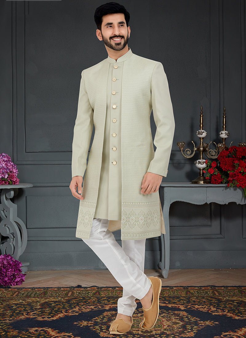Off Olive Pistachio Jecquard Traditional Wear Weaving Italian Indo Western