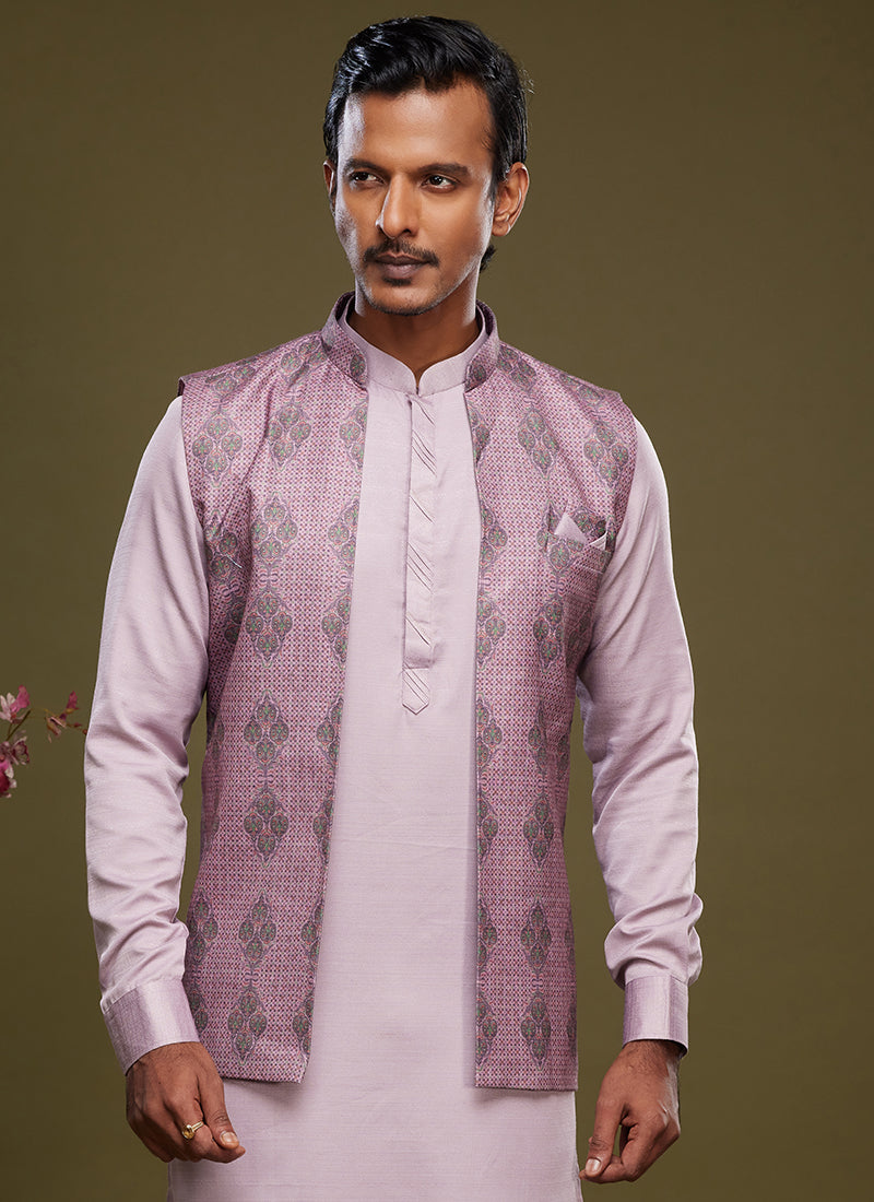 Purple Art Banarasi Silk Festival Wear Digital Printed Kurta Pajama With Jacket