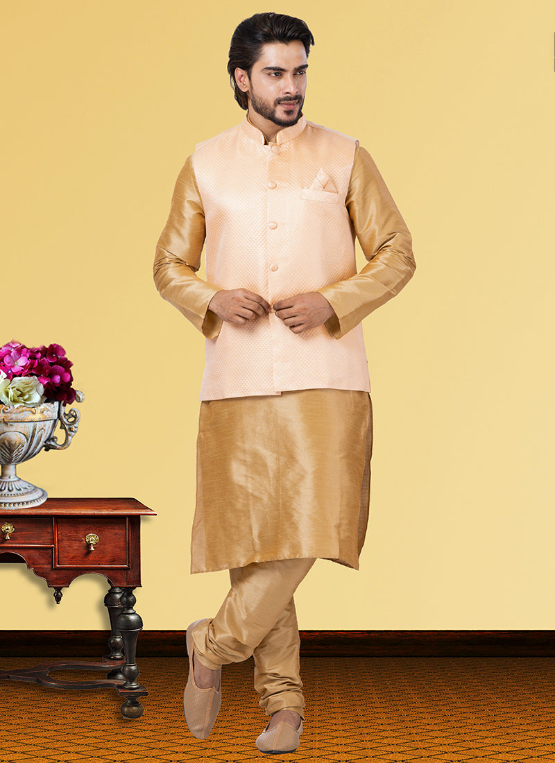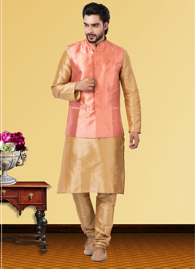 Peach Dupion Raw Silk Traditional Wear Weaving Kurta Pajama With Waistcoat