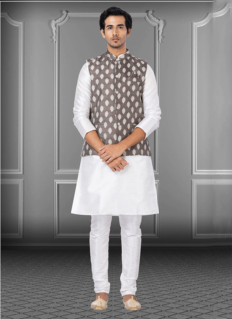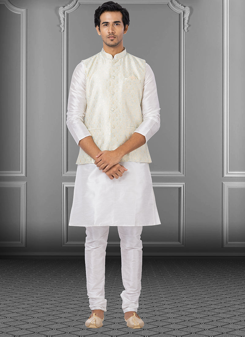 White Dupion Raw Silk Traditional Wear Weaving Kurta Pajama With Waistcoat