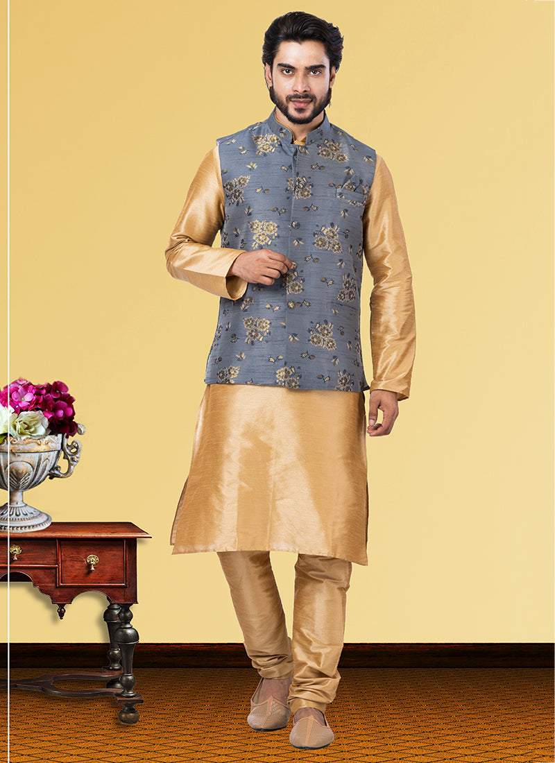 Graphit Dupion Raw Silk Traditional Wear Weaving Kurta Pajama With Waistcoat
