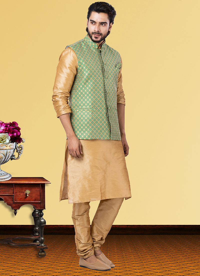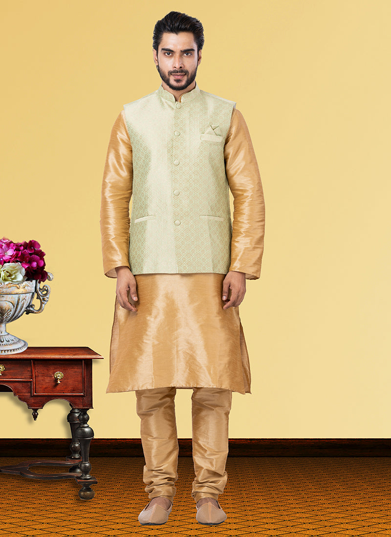 Light Pista Dupion Raw Silk Traditional Wear Weaving Kurta Pajama With Waistcoat