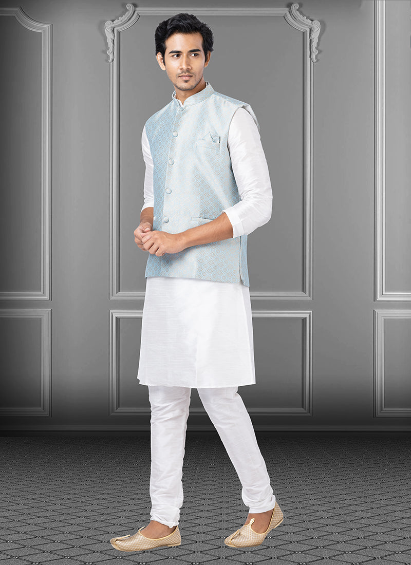 Light Blue Dupion Raw Silk Traditional Wear Weaving Kurta Pajama With Waistcoat
