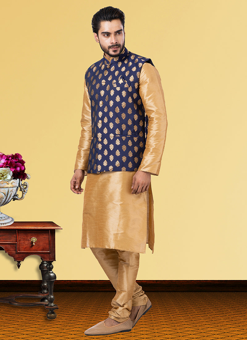 Navy Blue Dupion Raw Silk Traditional Wear Weaving Kurta Pajama With Waistcoat