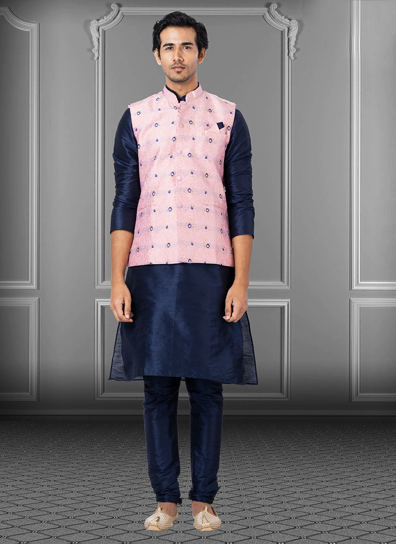 Light Pink Dupion Raw Silk Traditional Wear Weaving Kurta Pajama With Waistcoat