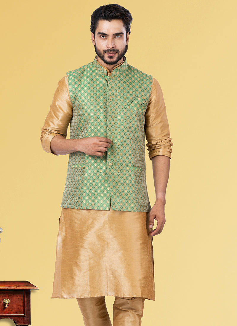 Green Jacquard Silk Party Wear Weaving Waistcoat
