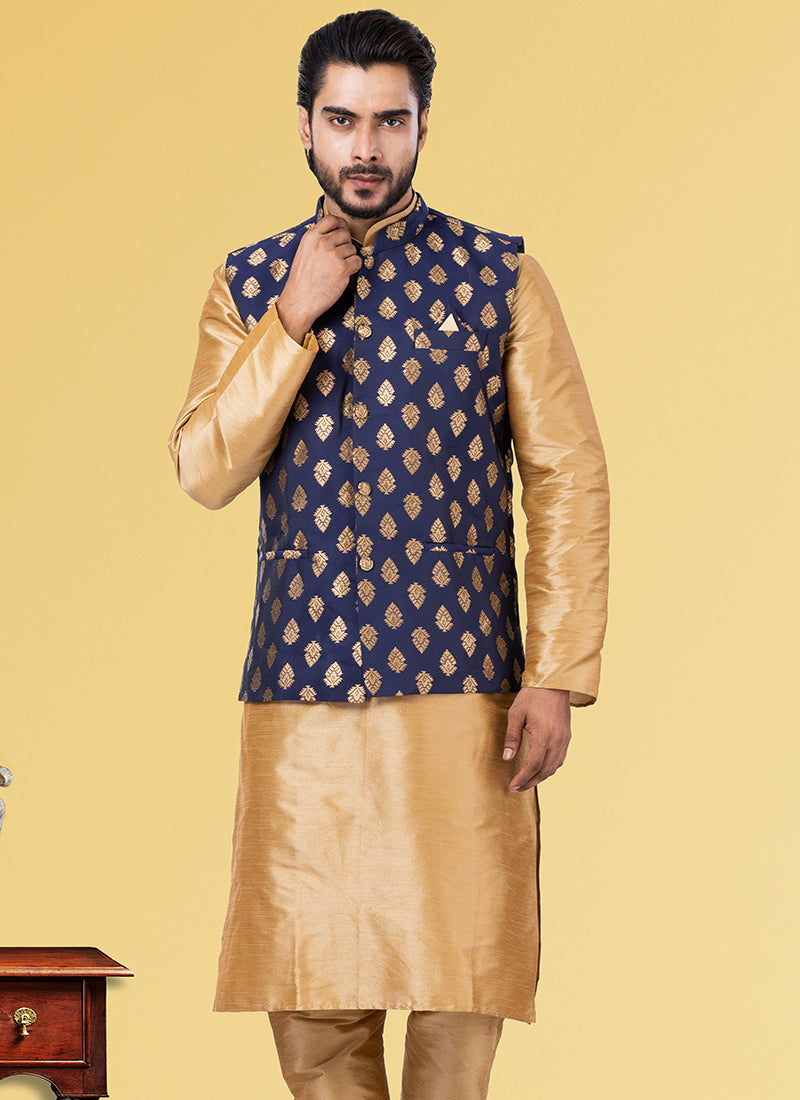 Navy Blue Jacquard Festival Wear Weaving Kurta Pajama