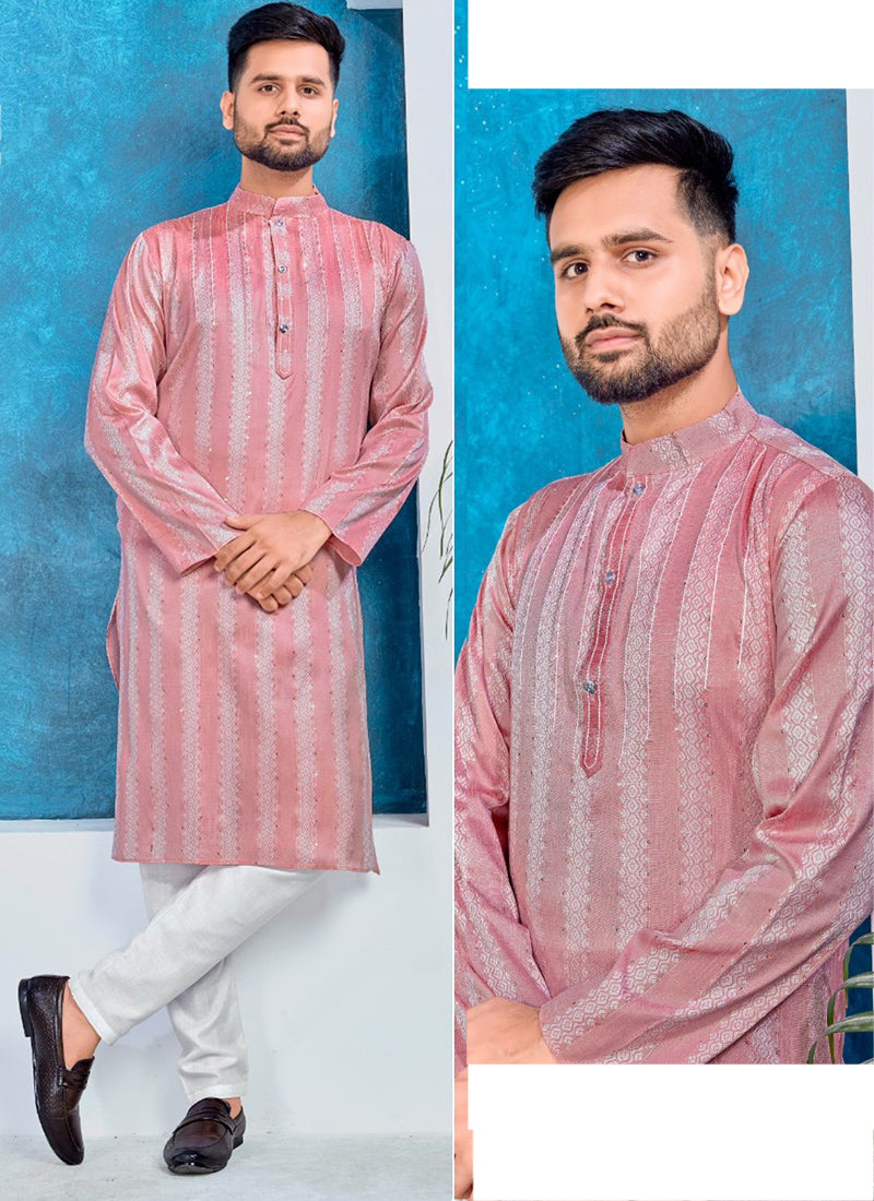 Pink Jacquard Silk Traditional Wear Weaving Kurta Pajama