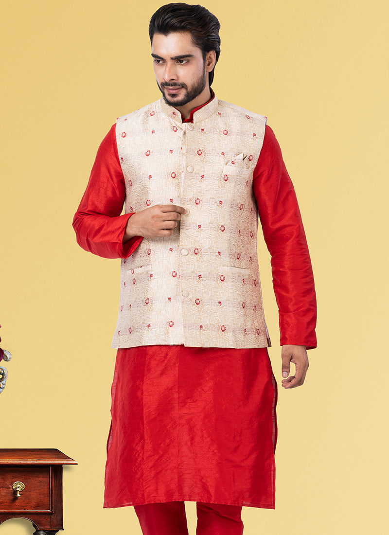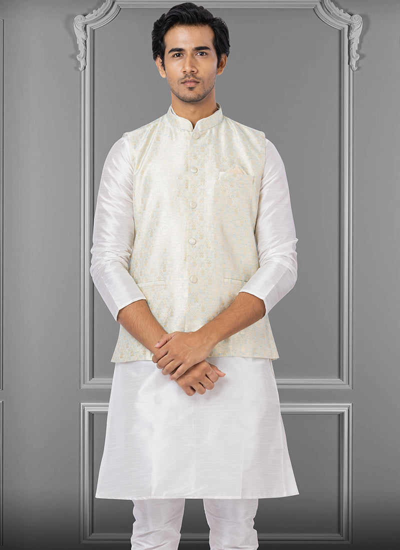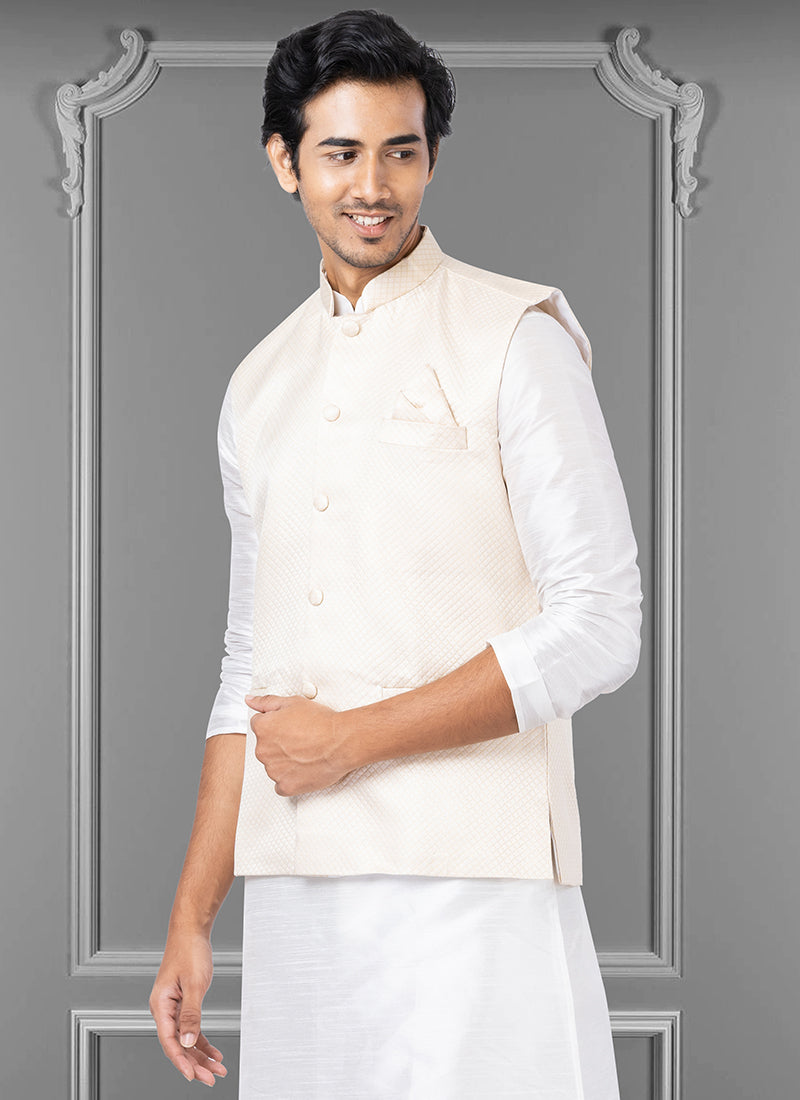 Cream Jacquard Silk Party Wear Weaving Waistcoat