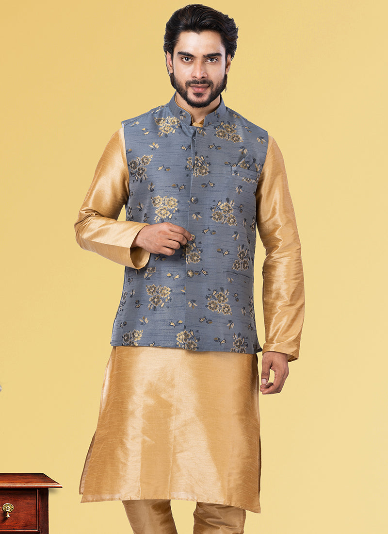 Grey Jacquard Silk Party Wear Weaving Waistcoat