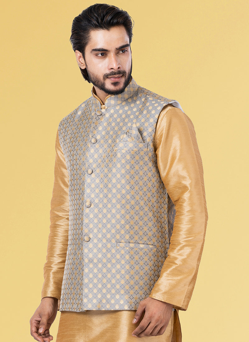 Light Grey Jacquard Silk Party Wear Weaving Waistcoat