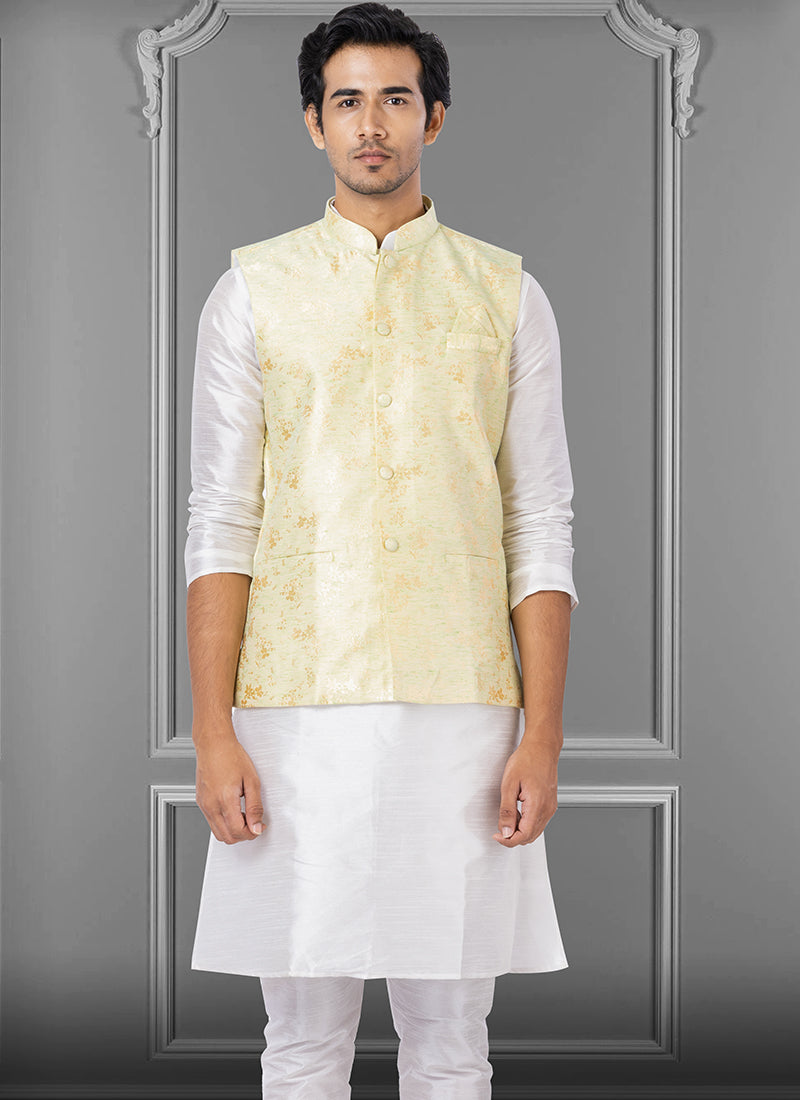 Light Green Jacquard Silk Party Wear Weaving Waistcoat