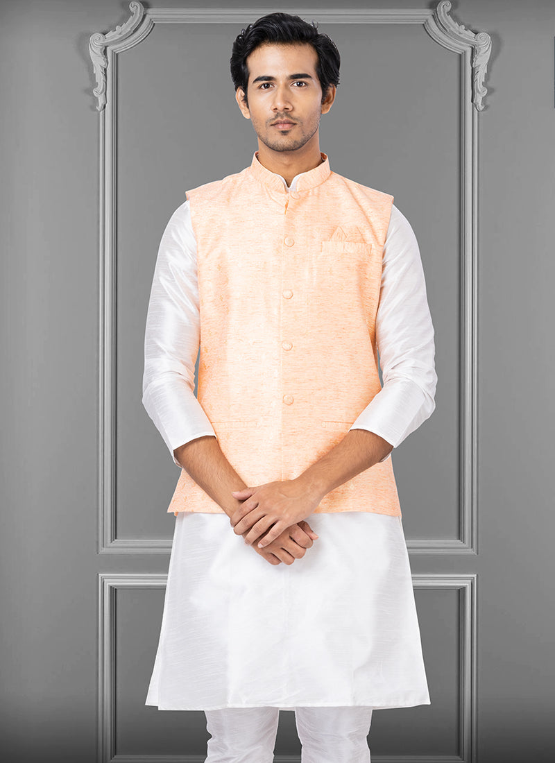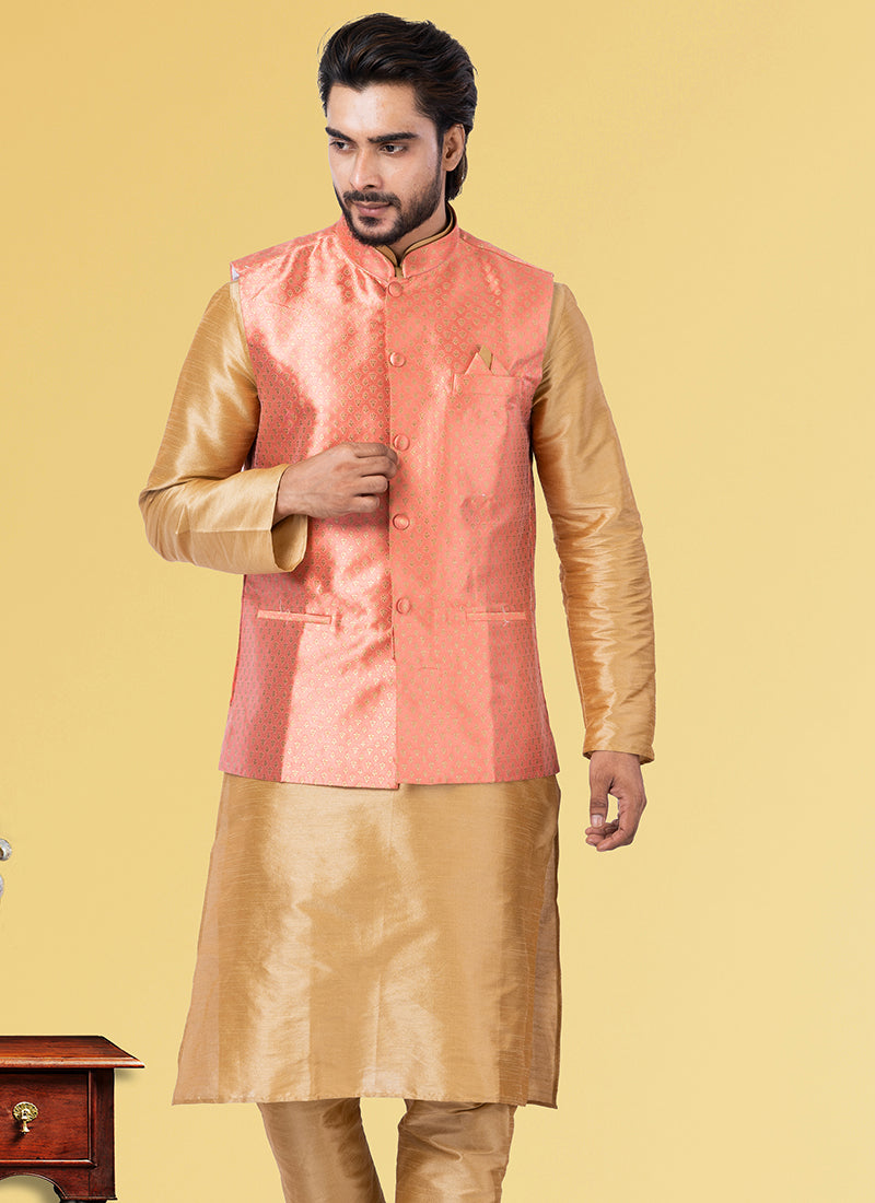 Light Peach Jacquard Silk Party Wear Weaving Waistcoat