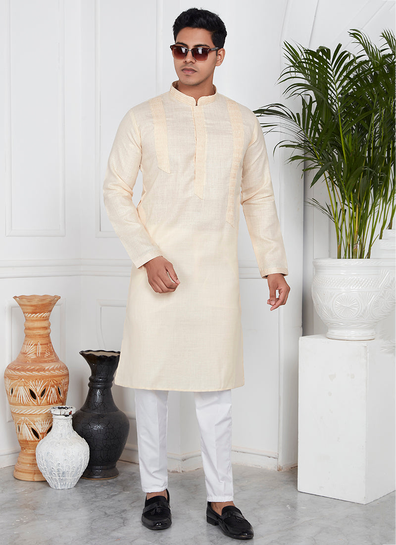 Linen Cotton Cream Traditional Wear Thread Work Kurta Pajama