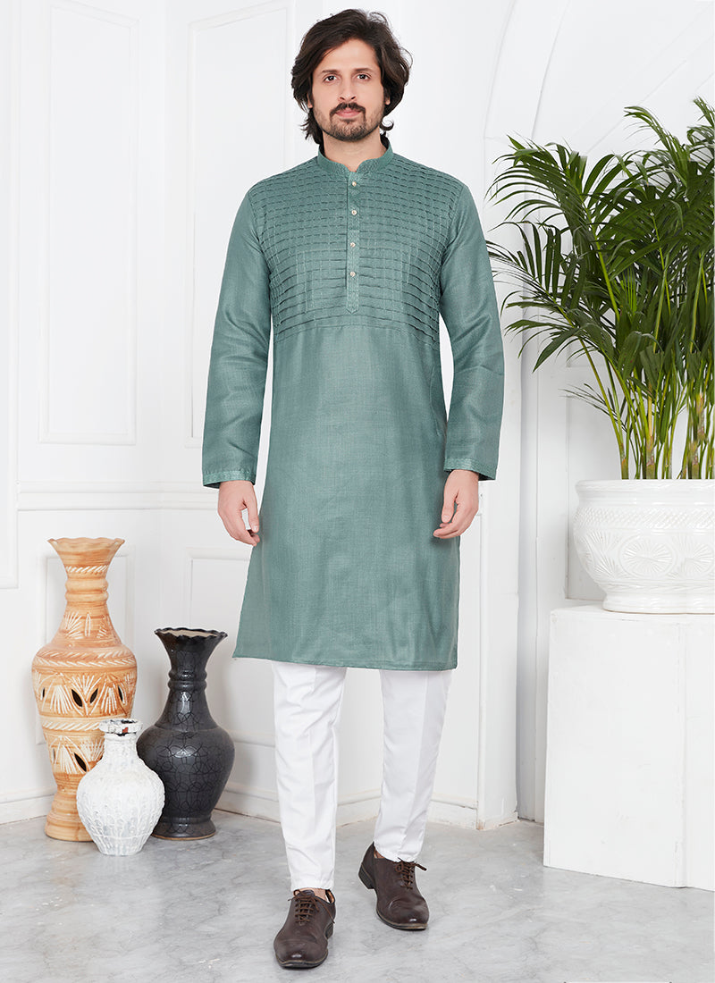 Linen Cotton Green Festival Wear Pintux Kurta Pajama